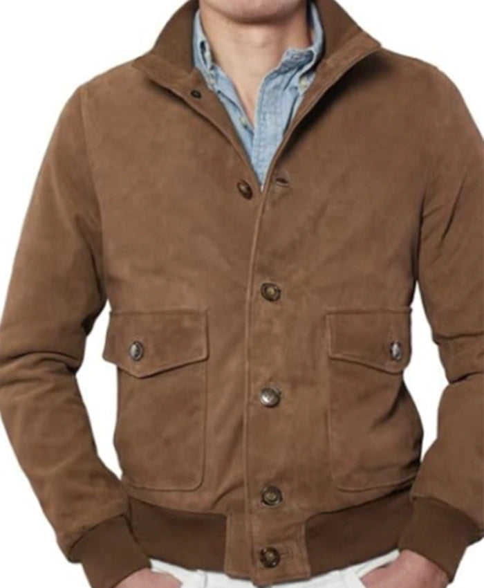 Eaton Brown Suede Bomber Jacket with the customizations you’ve outlined: